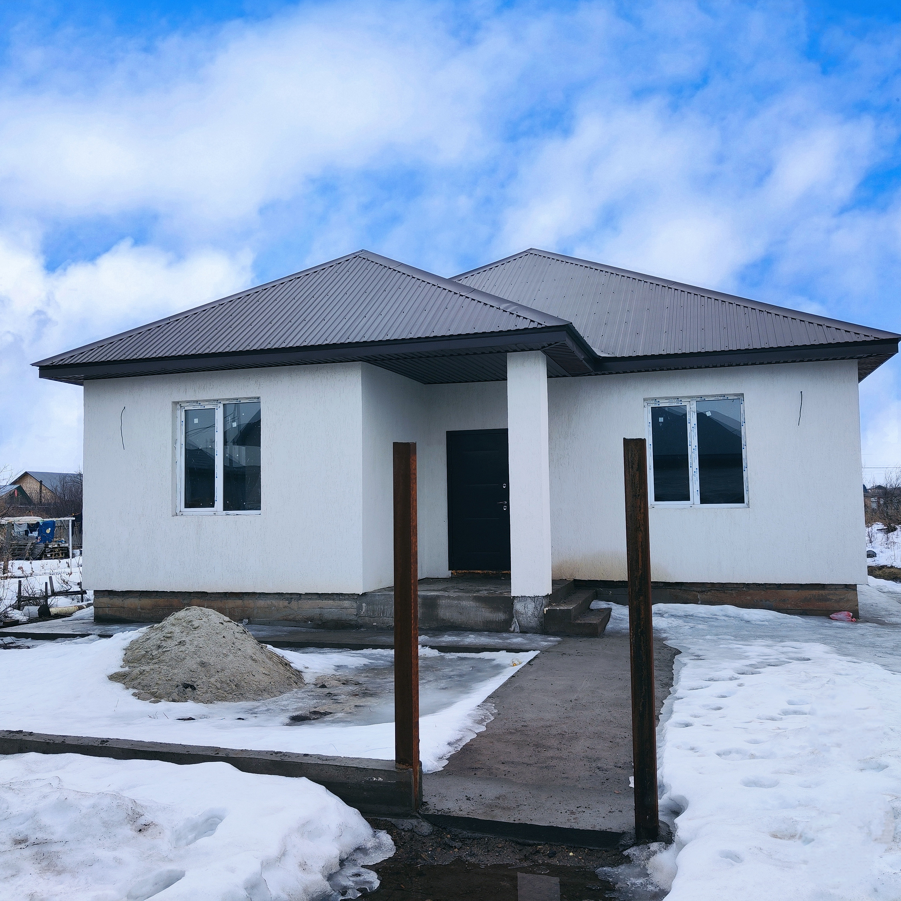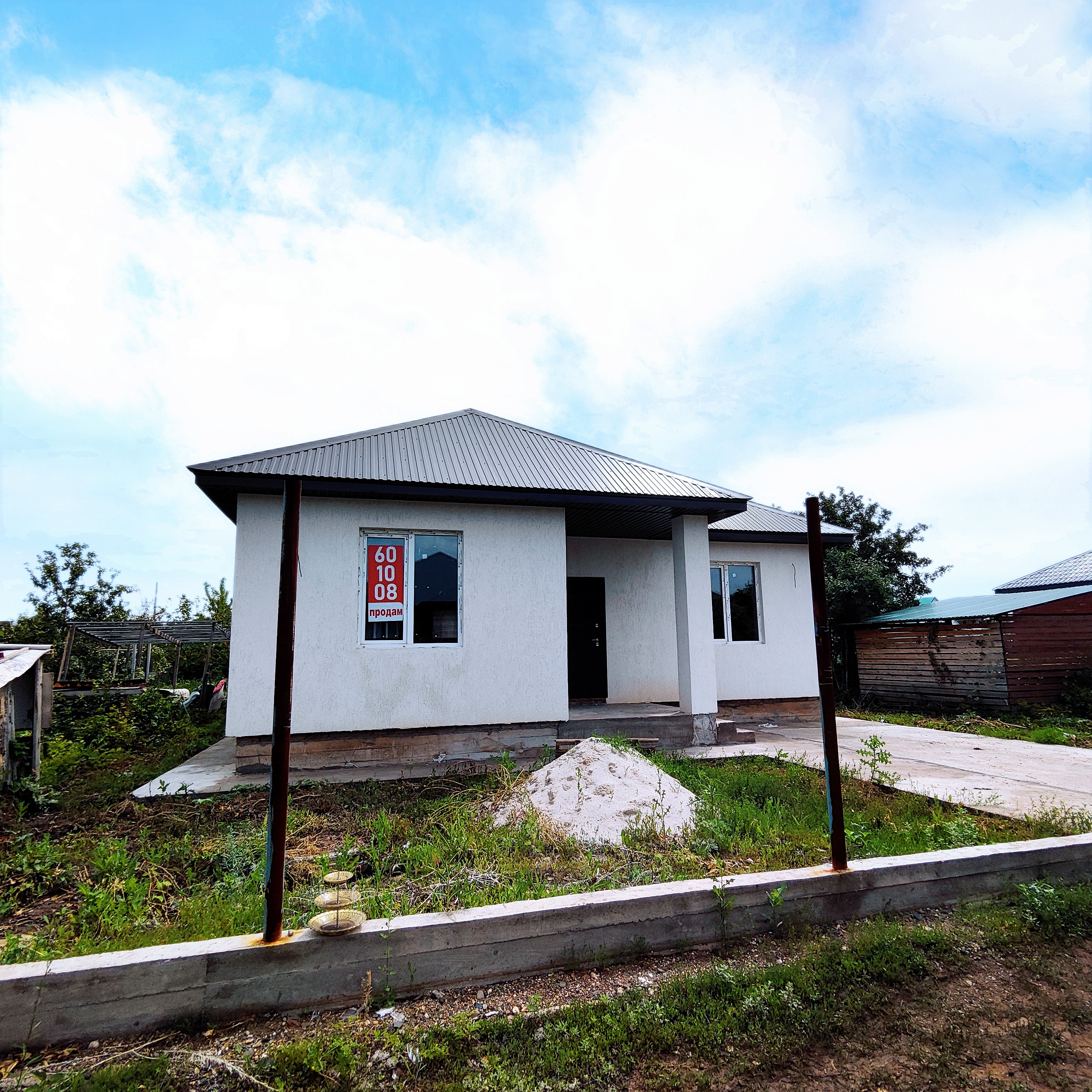 Перед домом залита бетоном площадка под парковку, залита дорожка.