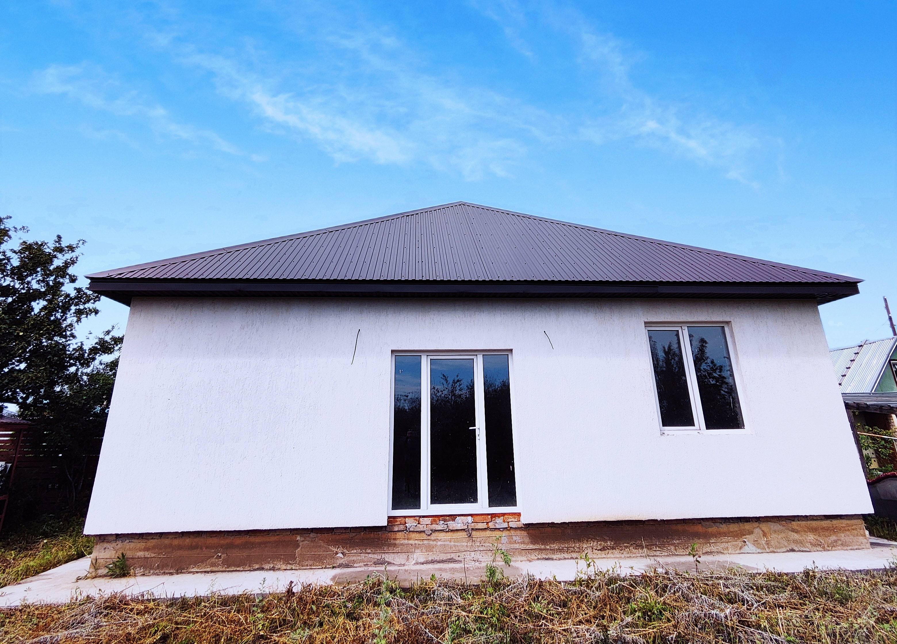 Все профили (оконные, дверные) ламинированные. Карниз графитовый, под цвет крыши.