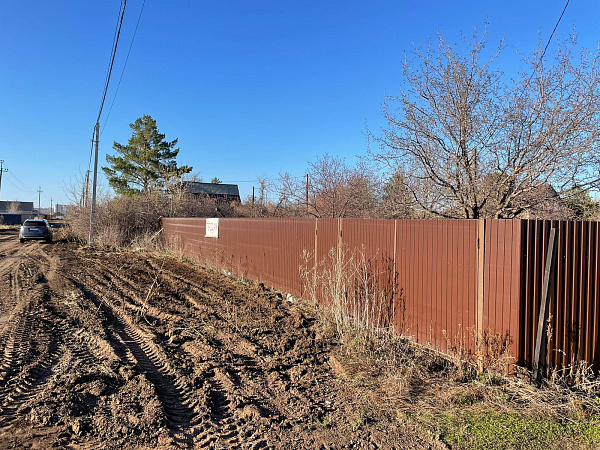 Огорожен забором, газ и вода по участку.