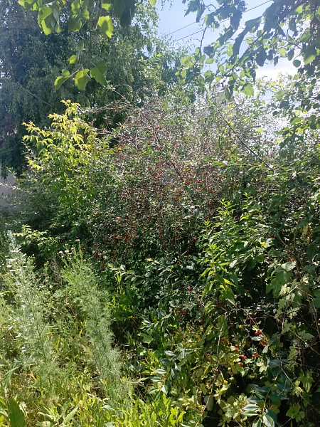 Ограждение профлист, ворота. Много насаждений : яблоня , слива , вишня , малина.