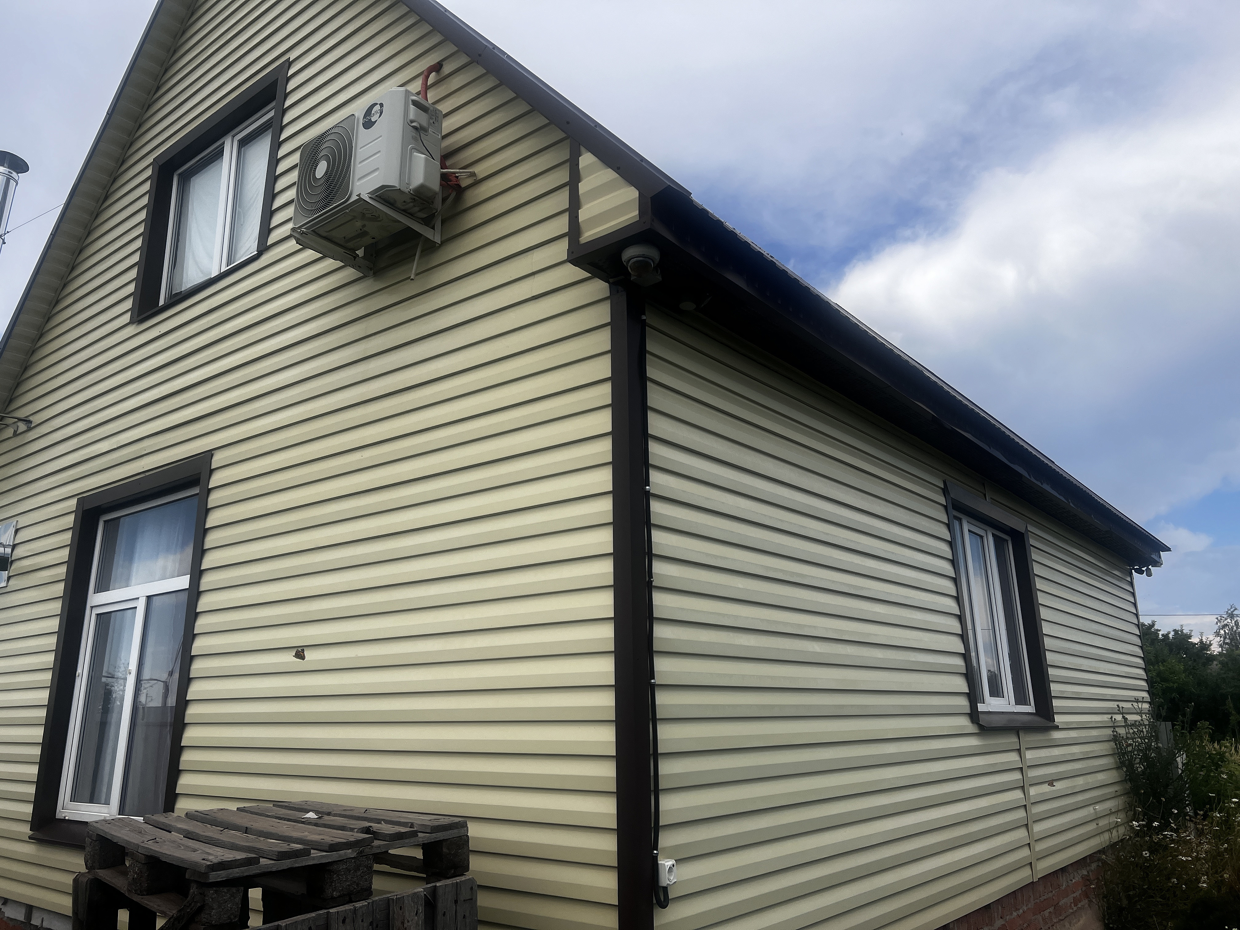 Брус , утеплитель, блицовка металлосайдинг, крыша профлист .