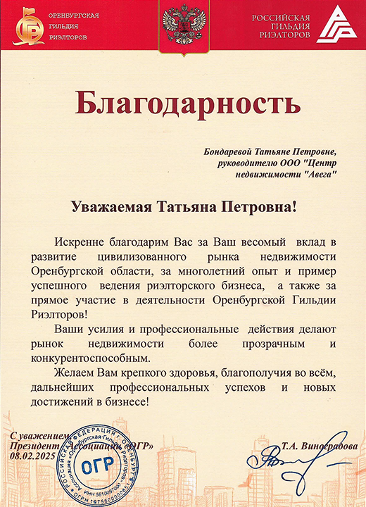 • Входим в состав Всероссийской гильдии риэлторов;