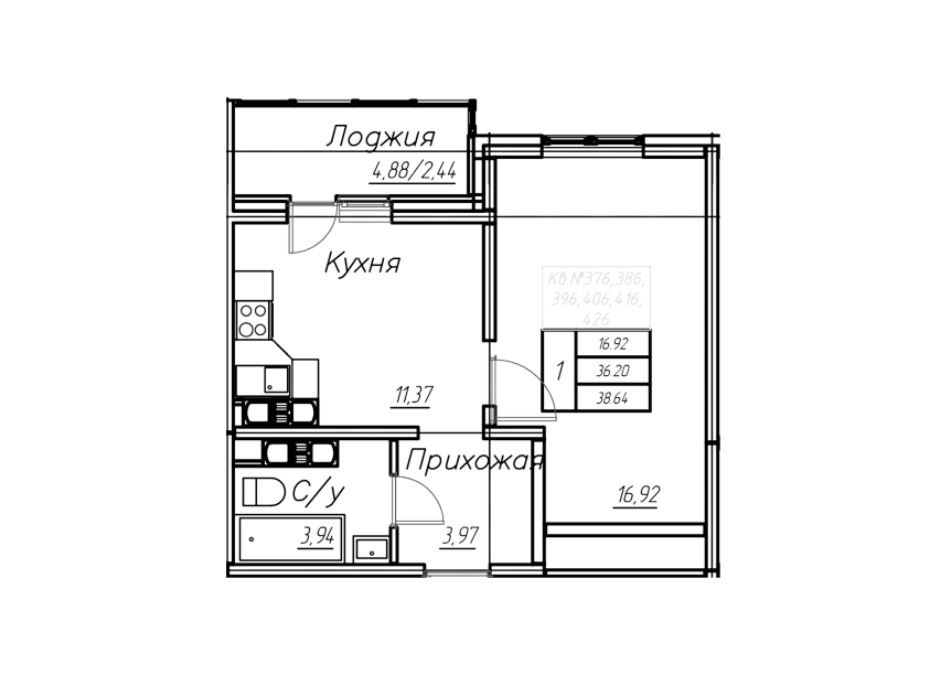 Общая площадь 38.64 м2